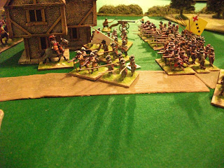 In the lane Malkin was having trouble getting his regiment to attack the clubmen. For some reason they feared farm implements more than muskets, (the clubmen had no musketeers). It took three attempts to get them to attack. The delay was crucial because Saville had at last rallied Bradshaw's regiment and when it arrived on the field it was immediately sent to cover the centre behind the clubmen. Before Bradshaw's were in position Malkin's men charged. Against the odds the clubmen held. It took a second push to drive them back and by then Bradshaw was in position and ready to fire.
