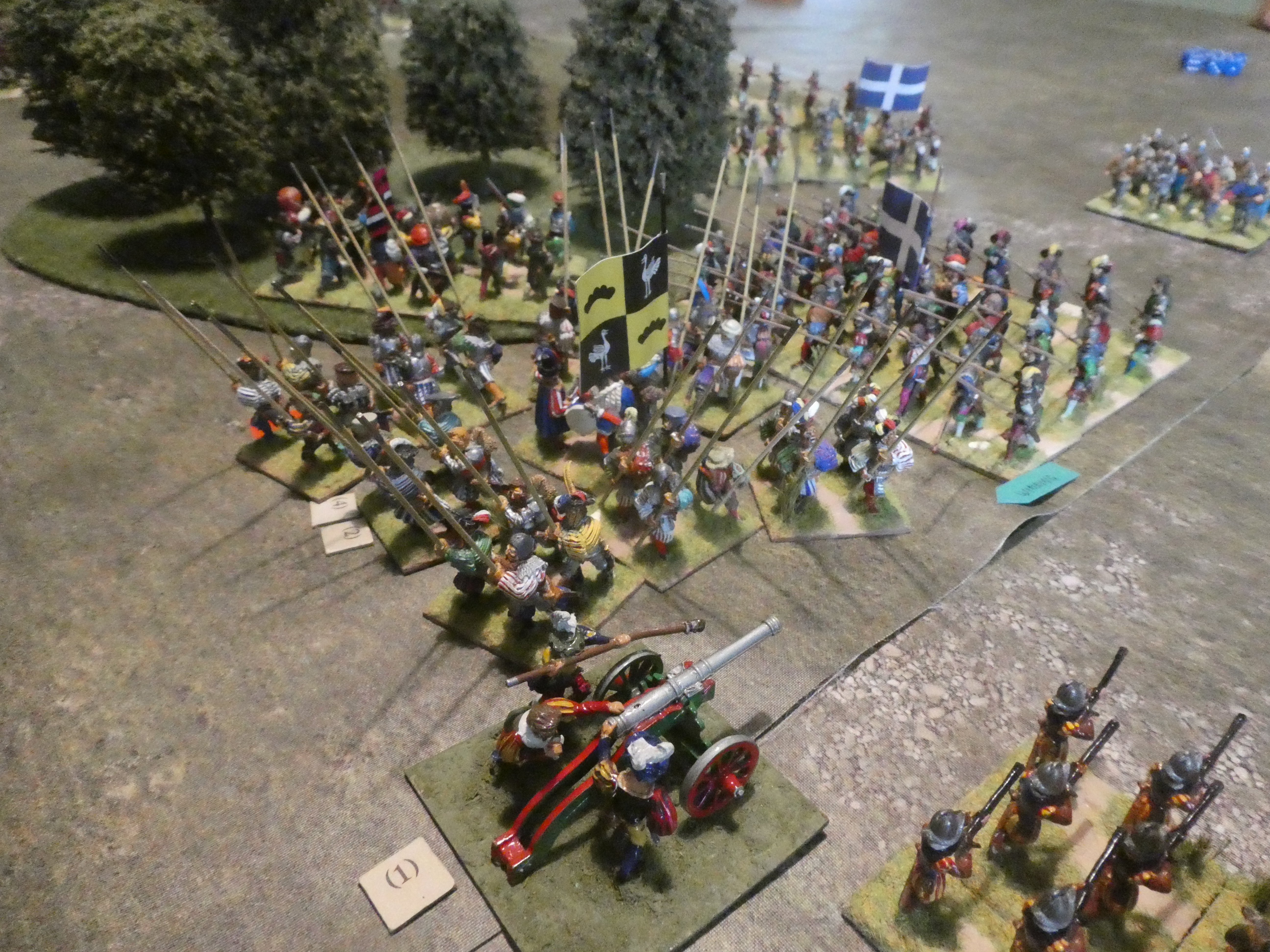The scenario is set in Italy during the Italian Wars and those two old protagonists the Duc du Merlot, commanding the French forces and the Count of Tempranillo commanding their Imperialist opponents, are both seeking a decisive battle.  The two sides met in the vicinity the minor settlement of San Cassiano.  The French, with their Swiss allies, have a slight advantage in cavalry, whereas the Imperialists have slightly more infantry.  Both commanders deploy in the classic way, cavalry on the flanks and infantry in the centre. The Duc du Merlot entrusted his right wing to the Comte de Malbec and the left to the Comte de Chardonnay.  In the centre were the Swiss and French pike blocks,  two units of crossbowmen, a light gun and a unit of halberdiers, all commanded by Lord Landroter.  Tempranillo entrusted his right wing to the Duke of Barbera and his left to Count Trebbiano.  In the centre Graf von Spatburgunder commanded the landsknecht pikes, a light gun, a unit of halberdiers and two units of arquebusiers.